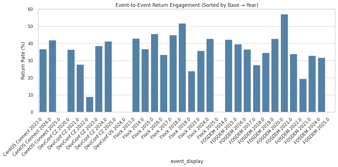 # Compute return rates by event_display with base + year includedreturn_rate = ( filtered_df.groupby(["event_display", "event_base", "event_year"])["returned_next_year"] .mean() .reset_index())# Convert to percentagereturn_rate["return_rate"] = return_rate["returned_next_year"] *100# Sort by base, then yearreturn_rate = return_rate.sort_values(["event_base", "event_year"])# Plotplt.figure(figsize=(12, 6))sns.barplot( data=return_rate, x="event_display", y="return_rate", color="steelblue")plt.xticks(rotation=45, ha="right")plt.ylabel("Return Rate (%)")plt.title("Event-to-Event Return Engagement (Sorted by Base → Year)")plt.tight_layout()plt.show()