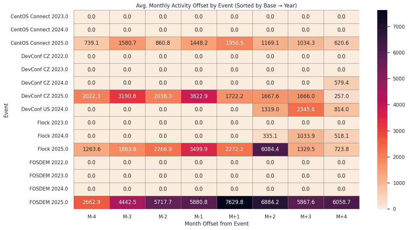 ---title: Event Contributor Analysisdescription: Each user is linked to an event based on their badge timestamp, and their activity is measured monthly from four months before to four months after the event (M-4 to M+4). Users are grouped as newcomers if they created their Fedora Account within 30 days prior to the event.date: 2025-10-12---