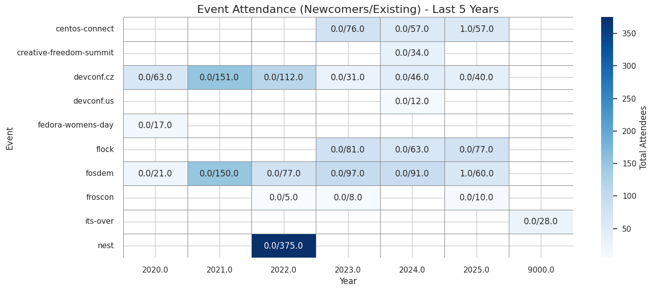 from datetime import datetime# --- Filter last 5 years ---current_year = datetime.now().yearrecent_df = df[df["event_year"] >= current_year -5].copy()# Count newcomers and existing by event/yearcounts = ( recent_df.groupby(["event_base", "event_year", "contributor_type"])["username"] .count() .reset_index())# Pivot to get newcomer + existing side by sidepivot = counts.pivot_table( index=["event_base", "event_year"], columns="contributor_type", values="username", fill_value=0).reset_index()# Add totalpivot["Total"] = pivot["Newcomer"] + pivot["Existing"]# Build heatmap matrix of totalsheatmap_data = pivot.pivot(index="event_base", columns="event_year", values="Total")# Build annotation matrix: "New/Existing"anno_matrix = heatmap_data.copy().astype(str)for idx, row in pivot.iterrows(): anno_matrix.loc[row["event_base"], row["event_year"]] =f"{row['Newcomer']}/{row['Existing']}"# --- Plot ---plt.figure(figsize=(14, max(6, len(heatmap_data) *0.6)))sns.heatmap( heatmap_data, annot=anno_matrix, fmt="", cmap="Blues", linewidths=0.5, linecolor="gray", cbar_kws={"label": "Total Attendees"})plt.title("Event Attendance (Newcomers/Existing) - Last 5 Years", fontsize=16)plt.xlabel("Year")plt.ylabel("Event")plt.tight_layout()plt.show()