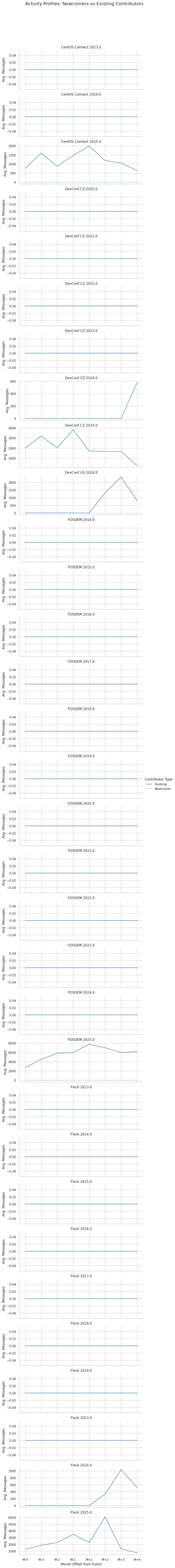 activity_cols = [f"M{-i}"for i inrange(4, 0, -1)] + [f"M+{i}"for i inrange(1, 5)]filtered_df = df[df["event_base"].isin(event_display_map.keys())].copy()# Melt into long format for time series plottingmelted = filtered_df.melt( id_vars=["event_display", "event_base", "event_year", "contributor_type"], value_vars=activity_cols, var_name="month", value_name="msg_count")# Aggregate average msg_countactivity_summary = ( melted.groupby(["event_display", "contributor_type", "month"])["msg_count"] .mean() .reset_index())# Sort monthsactivity_summary["month"] = pd.Categorical( activity_summary["month"], categories=activity_cols, ordered=True)# Plot — one row per event (using display names)g = sns.FacetGrid( activity_summary, row="event_display", hue="contributor_type", height=2.5, aspect=3, sharey=False, palette={"Newcomer": "lightblue", "Existing": "steelblue"})g.map(sns.lineplot, "month", "msg_count")g.add_legend(title="Contributor Type")g.set_axis_labels("Month Offset from Event", "Avg. Messages")g.set_titles("{row_name}")g.fig.subplots_adjust(top=0.95)g.fig.suptitle("Activity Profiles: Newcomers vs Existing Contributors", fontsize=16)plt.show()