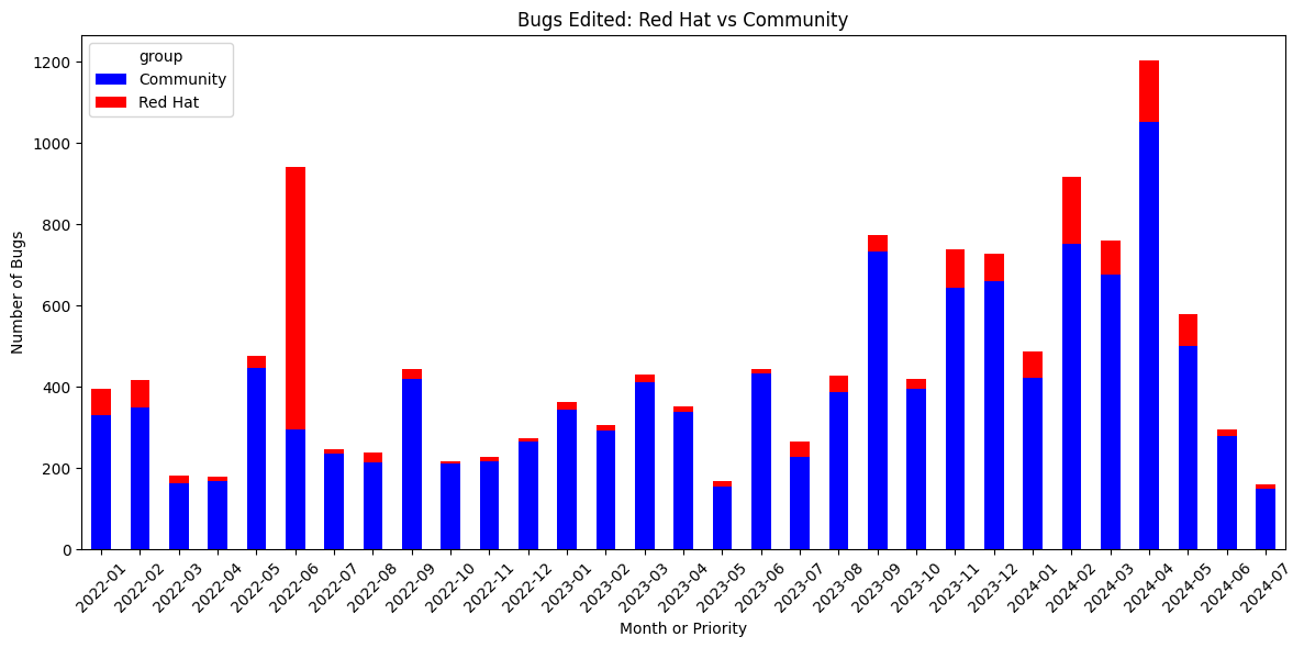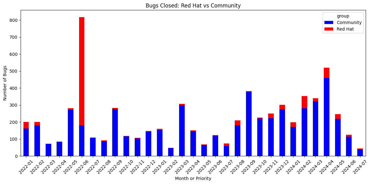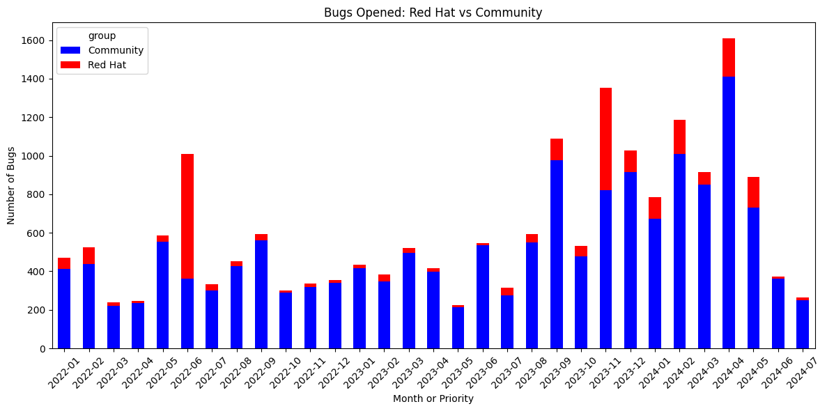 import matplotlib.pyplot as pltdef plot(df, title): df.sort_index().plot(kind="bar", color={"Red Hat": "red", "Community": "blue"}, stacked=True, figsize=(12,6)) plt.title(title) plt.ylabel("Number of Bugs") plt.xlabel("Month or Priority") plt.xticks(rotation=45) plt.tight_layout() plt.show()