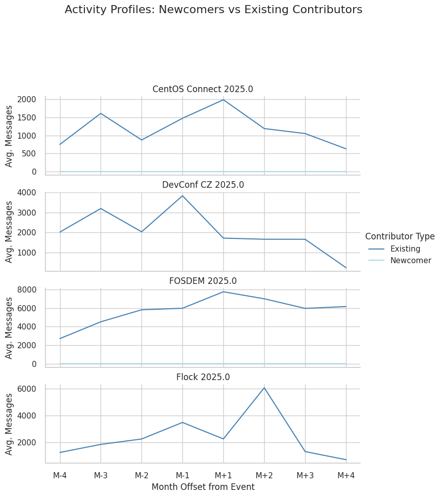 activity_cols = [f"M{-i}"for i inrange(4, 0, -1)] + [f"M+{i}"for i inrange(1, 5)]filtered_df = df[df["event_base"].isin(event_display_map.keys())].copy()current_year = datetime.now().yearfiltered_df = filtered_df[filtered_df["event_year"] == current_year]# Melt into long format for time series plottingmelted = filtered_df.melt( id_vars=["event_display", "event_base", "event_year", "contributor_type"], value_vars=activity_cols, var_name="month", value_name="msg_count")# Aggregate average msg_countactivity_summary = ( melted.groupby(["event_display", "contributor_type", "month"])["msg_count"] .mean() .reset_index())# Sort monthsactivity_summary["month"] = pd.Categorical( activity_summary["month"], categories=activity_cols, ordered=True)# Plot — one row per event (using display names)g = sns.FacetGrid( activity_summary, row="event_display", hue="contributor_type", height=2.5, aspect=3, sharey=False, palette={"Newcomer": "lightblue", "Existing": "steelblue"})g.map(sns.lineplot, "month", "msg_count")g.add_legend(title="Contributor Type")g.set_axis_labels("Month Offset from Event", "Avg. Messages")g.set_titles("{row_name}")g.fig.subplots_adjust(top=.8)g.fig.suptitle("Activity Profiles: Newcomers vs Existing Contributors", fontsize=16)plt.show()