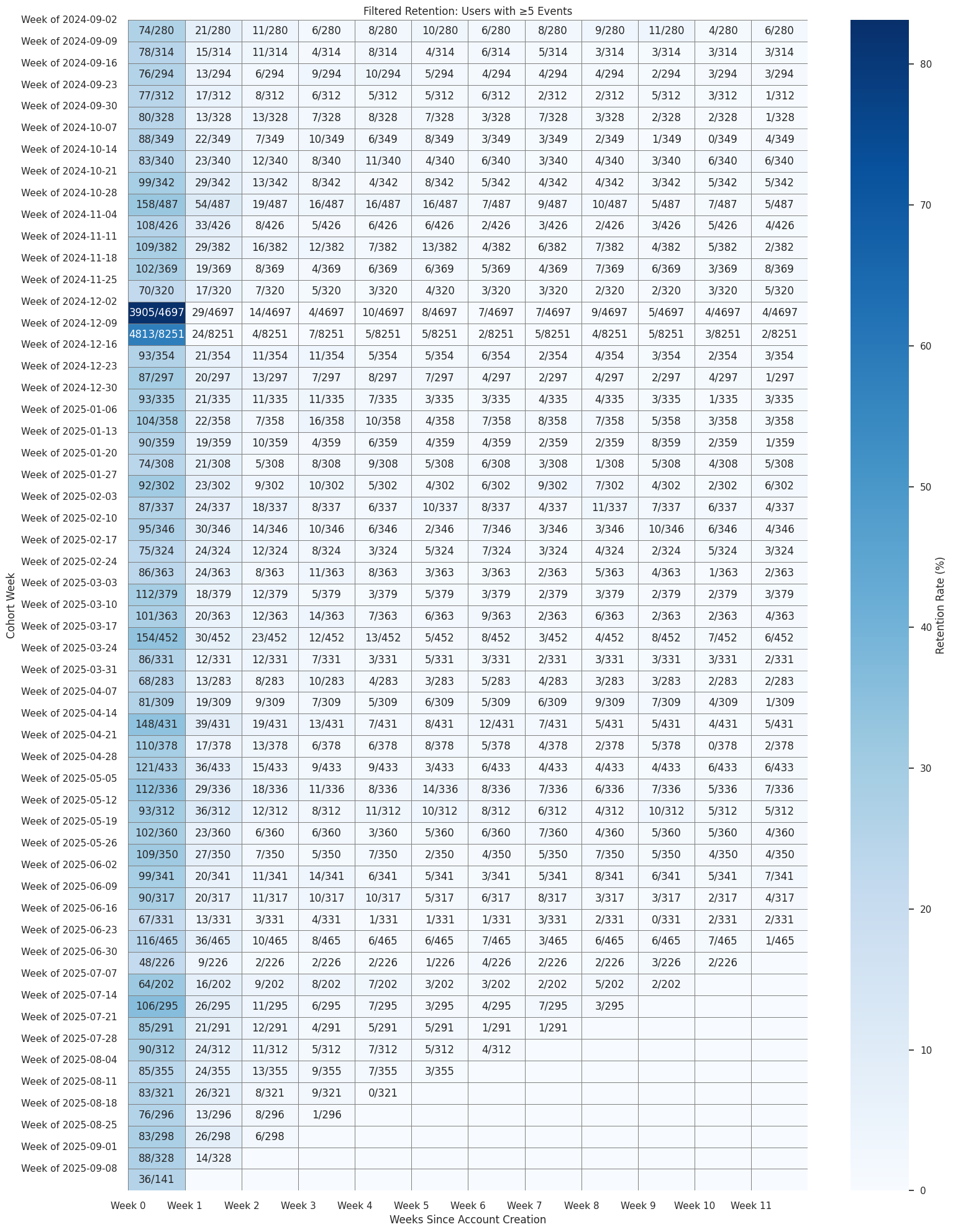 max_date = combined_df['sent_at'].max().date()annotated = retention_counts.astype(object).copy()for i, cohort inenumerate(annotated.index): cohort_start = pd.to_datetime(cohort_sizes.index[i], format='Week of %m/%d').date()for week in annotated.columns: week_date = cohort_start + timedelta(weeks=int(week))if week_date > max_date: annotated.loc[cohort, week] =" "else: returned = retention_counts.loc[cohort, week] total = cohort_sizes[cohort] annotated.loc[cohort, week] =f"{int(returned)}/{int(total)}"retention_rate = retention_rate.iloc[:, :12]annotated = annotated.iloc[:, :12]label_map = new_users_df.drop_duplicates('cohort_week').set_index('cohort_week')['cohort_label']
