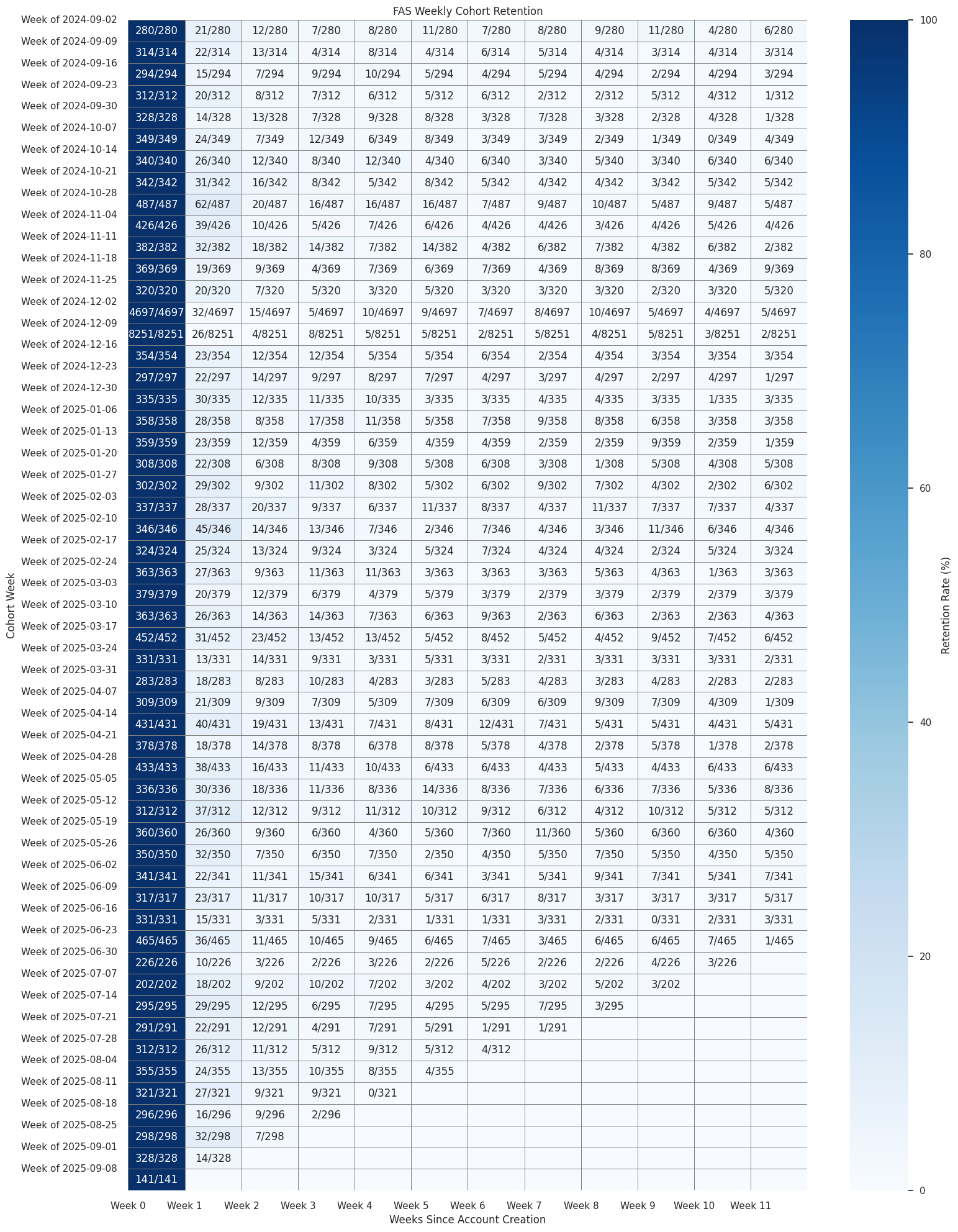 plt.figure(figsize=(16, 20))sns.heatmap( retention_rate, annot=annotated, fmt="", cmap="Blues", cbar_kws={'label': 'Retention Rate (%)'}, linewidths=0.5, linecolor='gray')plt.title('FAS Weekly Cohort Retention')plt.xlabel('Weeks Since Account Creation')plt.ylabel('Cohort Week')plt.xticks(ticks=range(12), labels=[f"Week {i}"for i inrange(12)])plt.yticks( ticks=np.arange(len(retention_rate.index)), labels=[label_map.get(cohort, cohort.strftime('%Y-%m-%d')) for cohort in retention_rate.index])plt.tight_layout()plt.show()