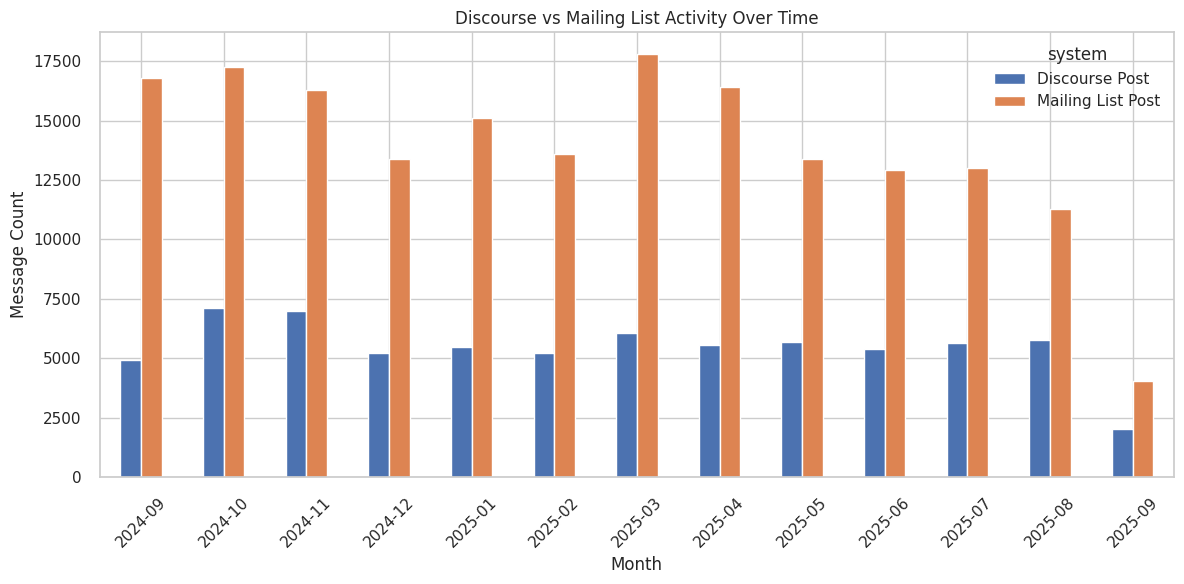 activity_summary.plot(kind='bar', figsize=(12,6))plt.title('Discourse vs Mailing List Activity Over Time')plt.xlabel('Month')plt.ylabel('Message Count')plt.xticks(rotation=45)plt.tight_layout()plt.show()